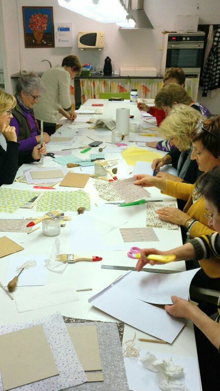 Desde octubre hemos ido realizando distintos talleres, algunos ya tradicionales como el de Cocina de Navidad y otros novedosos como el de Encuadernación Japonesa o Taller de Mimbre de papel para hacer adornos navideños. Este año en el taller de Cocina Navideña hemos elaborado un menú muy sugerente: Zamburiñas con gratén de lima, Piruletas de cerdo con chutney de peras y de postre un trifle de café, cacao y crema de mascarpone. En el taller de Encuadernación japonesa han hecho unas estupendas libretas con sus tapas forradas de tela y encuadernadas por ellas mismas.