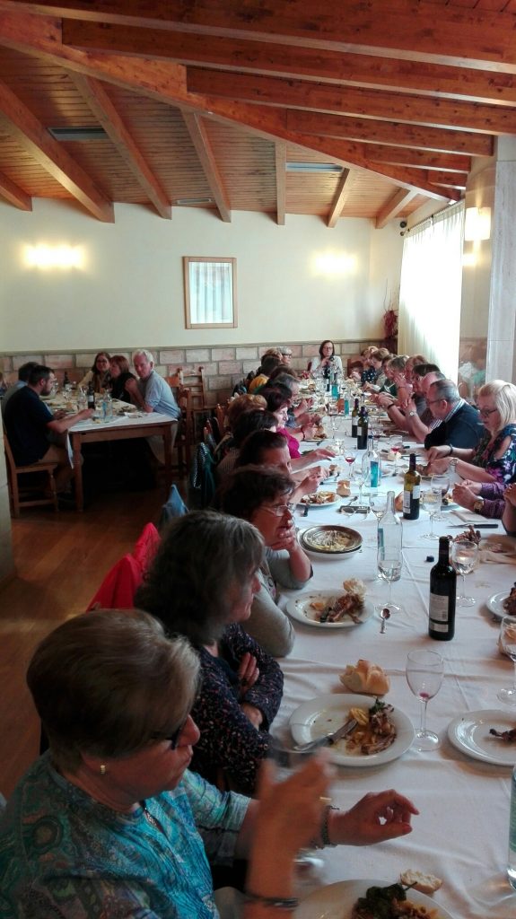 Después de catar unos estupendos vinos nos vamos al centro de Logroño a comer. Nos reciben en el Meson Cid donde nuestros viajeros degustan paella y un exquisito ternasco a la plancha o al horno que hace las delicias de nuestros comensales, como no, la comida regada con un excelente Rioja.